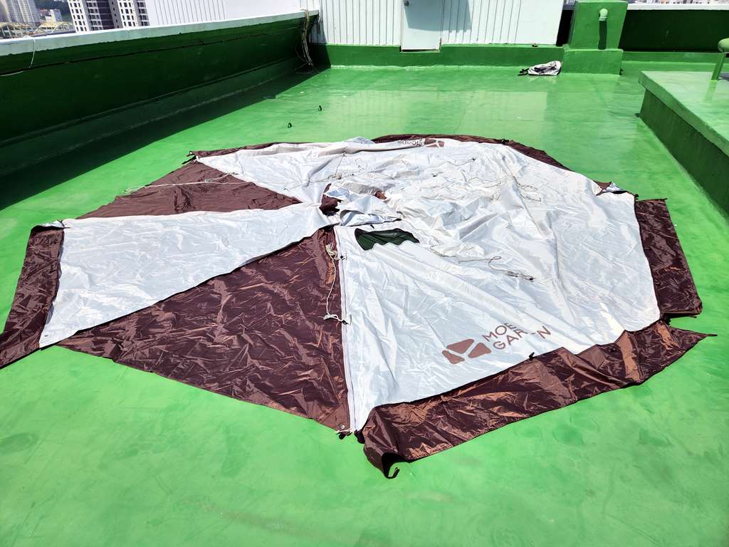 바닥에 있으면 폴을 다 끼워서 탱탱하게 해줘야 접힌 부분이 없어서 습기를 말릴수 있거든요.