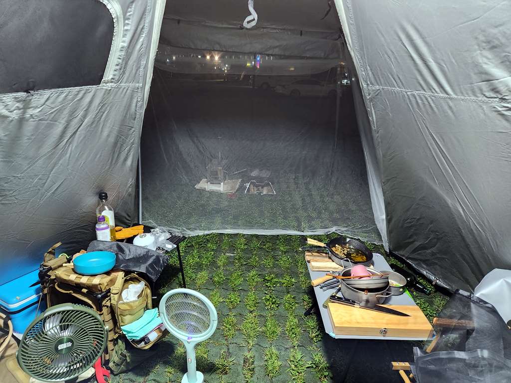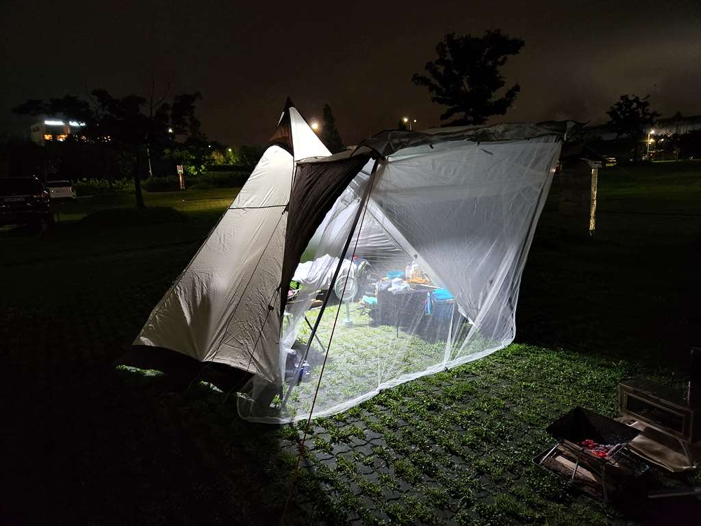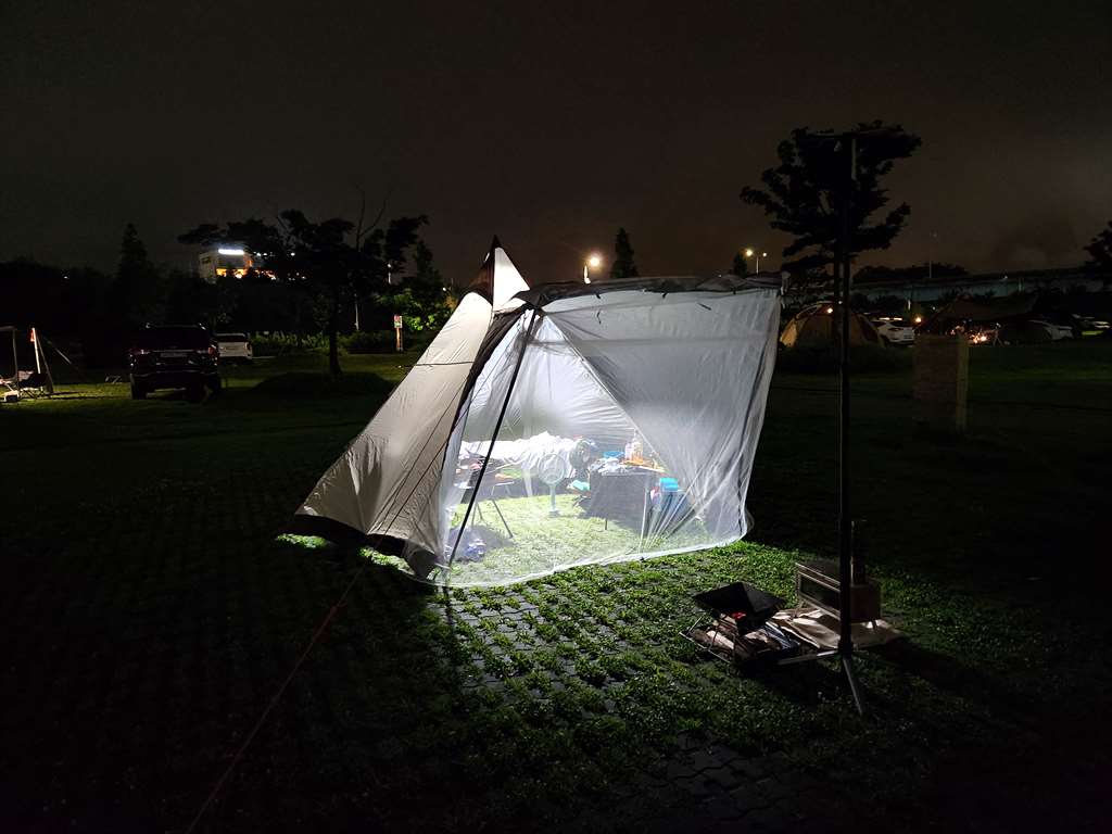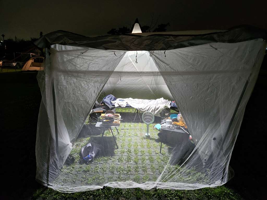 따로 모기장이 없는 텐트라... 그냥 알리에서 모기장 사서 앞에 걸쳤습니다. 틈이 많네요..