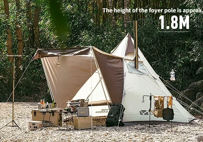 앞에 출입문도 넓고, 무엇보다 티피 텐트 대부분이 가운데 폴대가 있는 구조라면 이 제품은 뒤집어진 V 형 폴대라 가운데 지지대가 없습니다.