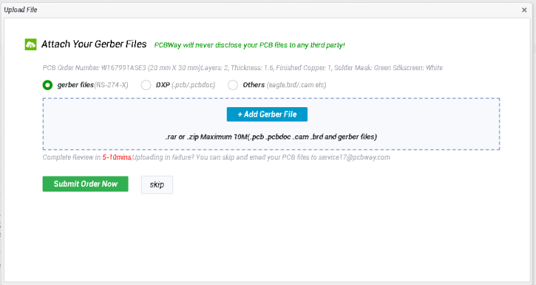 9. Save to cart 를 클릭하면 거버 파일을 업로드 할 수 있는 팝업이 뜹니다.