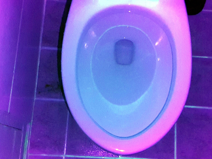 변기에 형광 물질 같은게 보이죠? 그리고 소변이 자외선에 반응한다는 것을 보이기 위해 소변을 내리기 전에 찍었습니다.