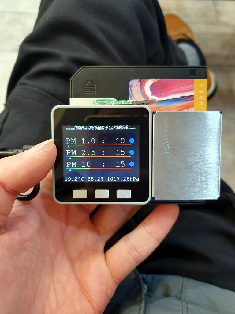 미세 먼지 측정기 자작 하실 분은 아래 깃허브에 올려 두었습니다. https://github.com/dudals-jung/Arduino-M5Stack_BME280_PMS7003 CPU, LCD, 배터리 모듈인 M5Stack 40달러 정도. 미세 먼지 센서 PMS7003 13달러 정도 온도, 습도, 기압 센서 BME280 5천원 정도 그외 약간의 납땜 가능한 도구 정도와 아두이노 개발툴 입니다. PM 2.5 PM10 은 국내 기준으로 설정했는데, PM1.0 은 안 보이길래 PM2.5 와 같이 했습니다. 아두이노 사용하시는 분은 꼭 M5Stack 가 아니더라도 다른 아두이노 제품에 붙이는데는 어려움은 없을겁니다.